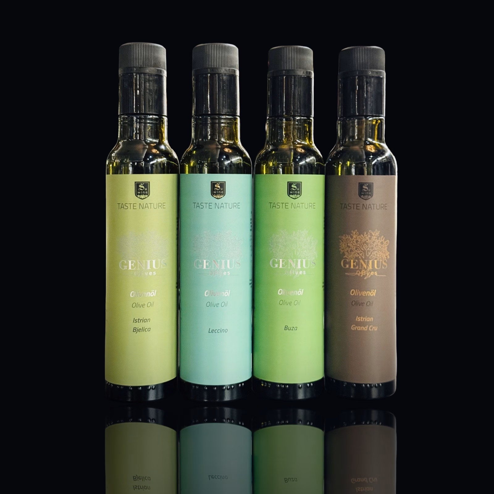 Premium Olivenöle aus Istrien. Sorten: Leccino, Buza, Istrian Bjelica und Istrian Grand Cru.